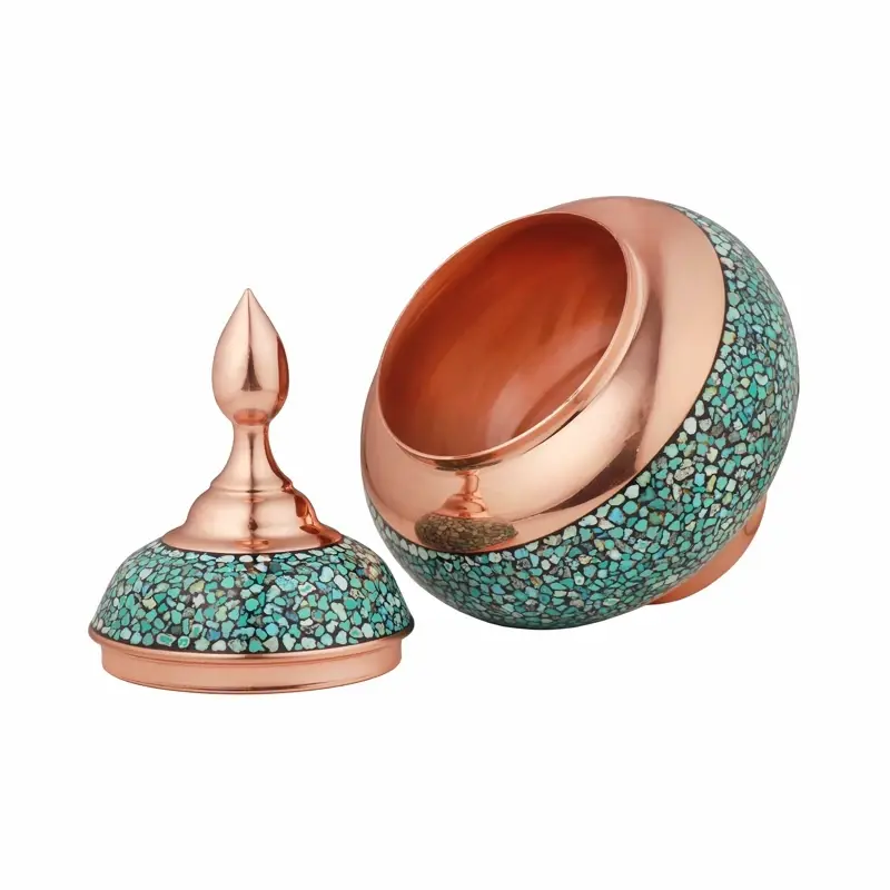Embodying the essence of traditional Iranian artistry, the Handmade Firoozeh Koobi Turquoise on Copper Candy Dish is more than a vessel—it’s a tribute to Persian culture and meticulous craftsmanship. This dazzling centerpiece combines centuries-old metalwork with the brilliance of Persian turquoise stones, arranged delicately across its copper body in the revered Firoozeh Koobi style.