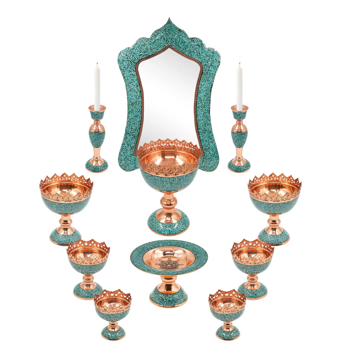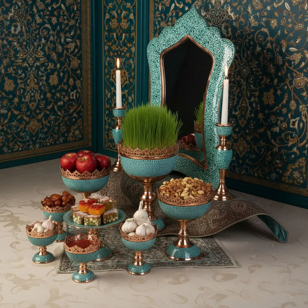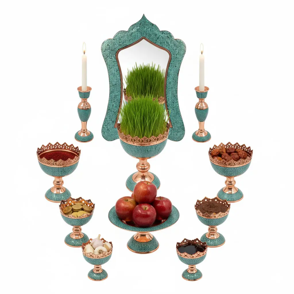 Handmade Firoozeh Koobi Turquoise on Copper Haft Sin Set– Luxury Norooz Decoration
