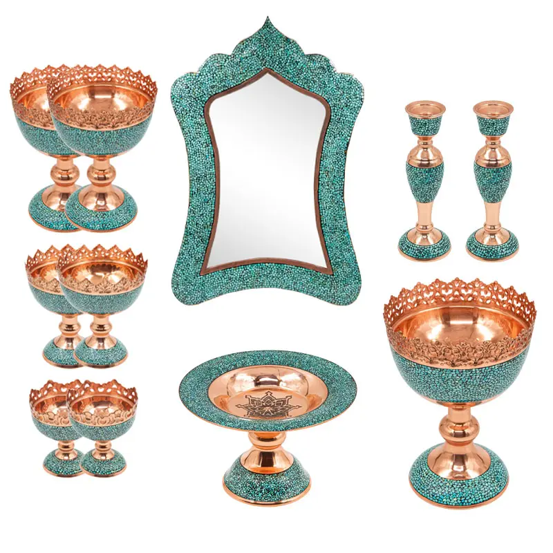 Handmade Firoozeh Koobi Turquoise on Copper Haft Sin Set– Luxury Norooz Decoration Description: