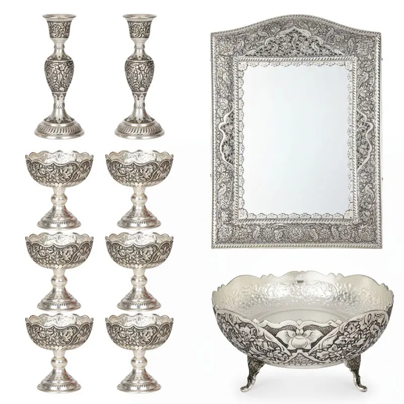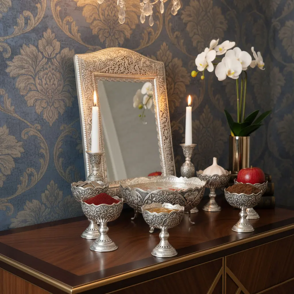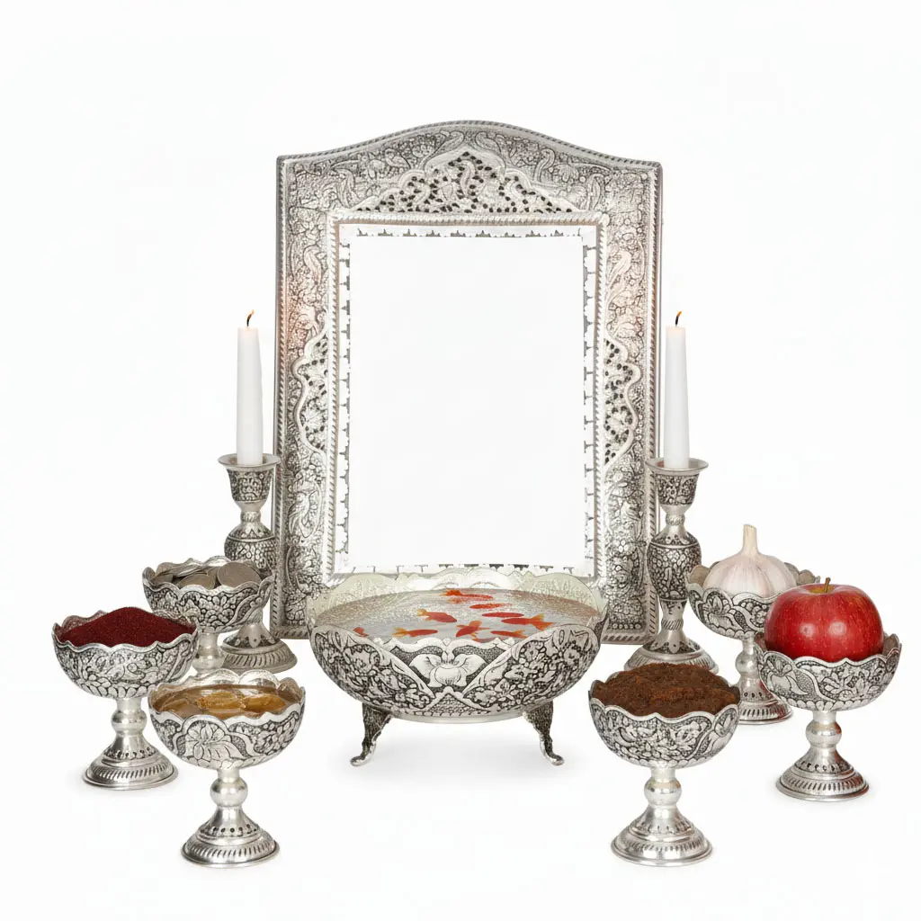 Handmade Ghalamzani Silver Plated Haft-Sin Set for Nowruz